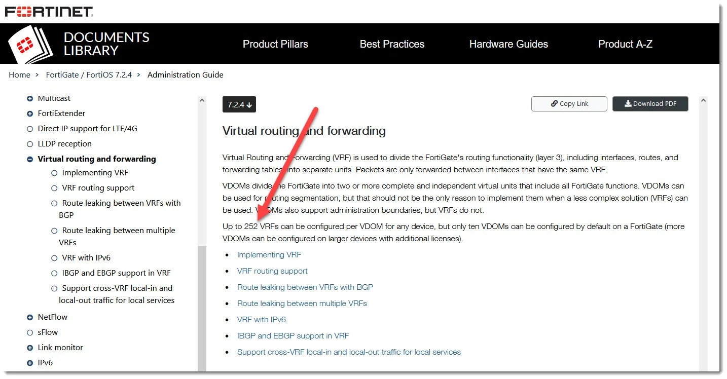 So if physical interfaces aren’t our bottleneck here what then, IS the limit? We originally benched a solution using VDOMs on FortiGate which were limited on models we regularly use to 10 but then we solved it using VRF and as you can see in the doc screenshot below these have a MUCH higher ceiling. Naturally we’d want to size the FortiGate accordingly but it’s pretty cool to see how high the ceiling can be!
