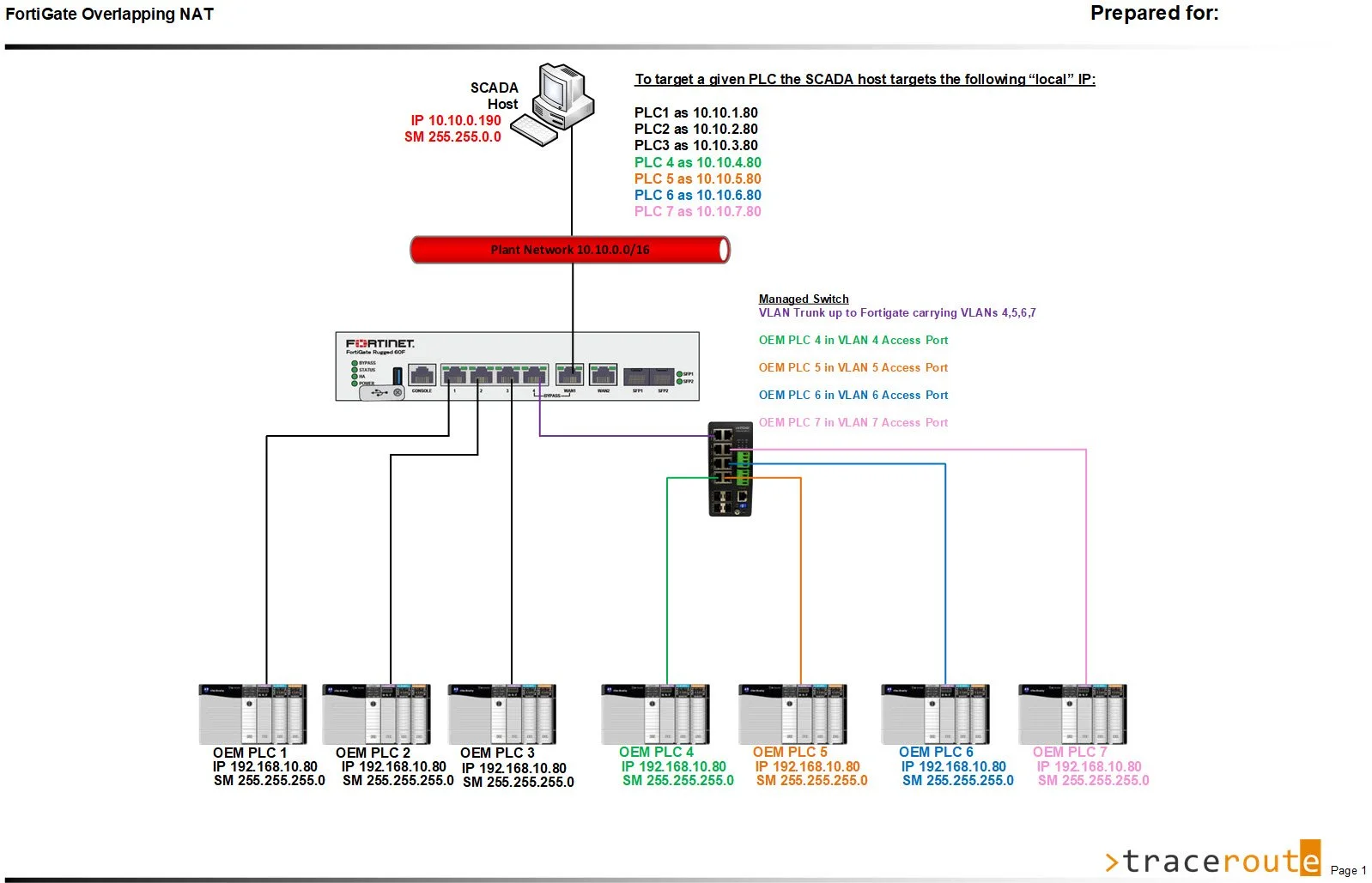 Below we drew up an example of seven overlapping cells with every cell PLC addressed identically 192.168.10.80 /24. Whereas this normally would require one NAT appliance per cell, we can perform NAT for these seven cells using a SINGLE FortiGate.