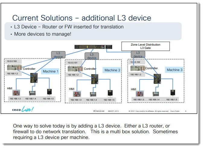 Cisco or Rockwell will say the L3 NAT version of solving the same situation as the image above requires one L3 NAT appliance per skid/machine (refer back to Image 2) but I would counter: