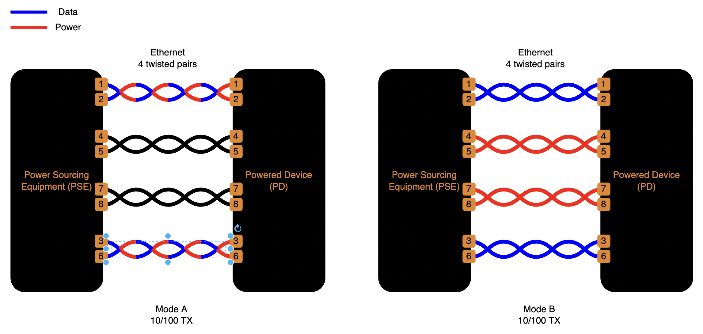 The 802.3af standard describes two different modes for powering 10/100 TX devices, Mode A and Mode B. An ethernet cable has 4 twisted pairs. The difference between Mode A and Mode B are in what wire pairs power is supplied.