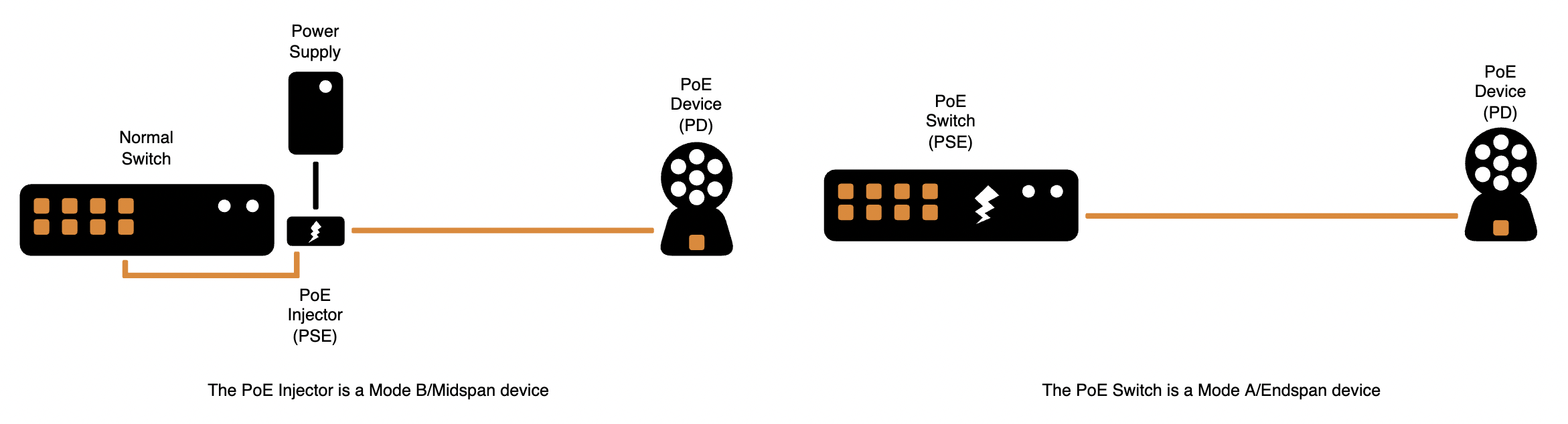 A Mode A PSE is also known as an endspan device and a Mode B PSE is also known as a midspan device, which describes the position in the system of where the power is coming from. A PoE switch would be endspan, and a PoE injector would be midspan.