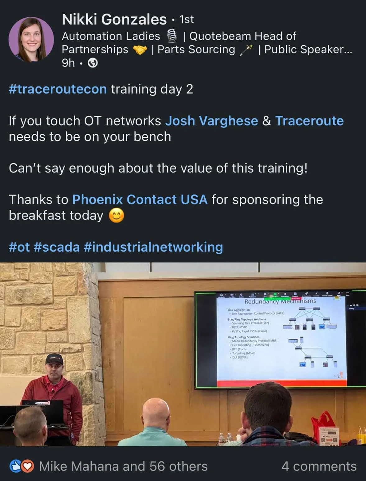 We curate content in our two-day trainings for an OT audience and pair it with hands-on demonstrations and exercises that get you under the hood of an industrial ethernet network. Check out some of the topics as well as sample slides below.